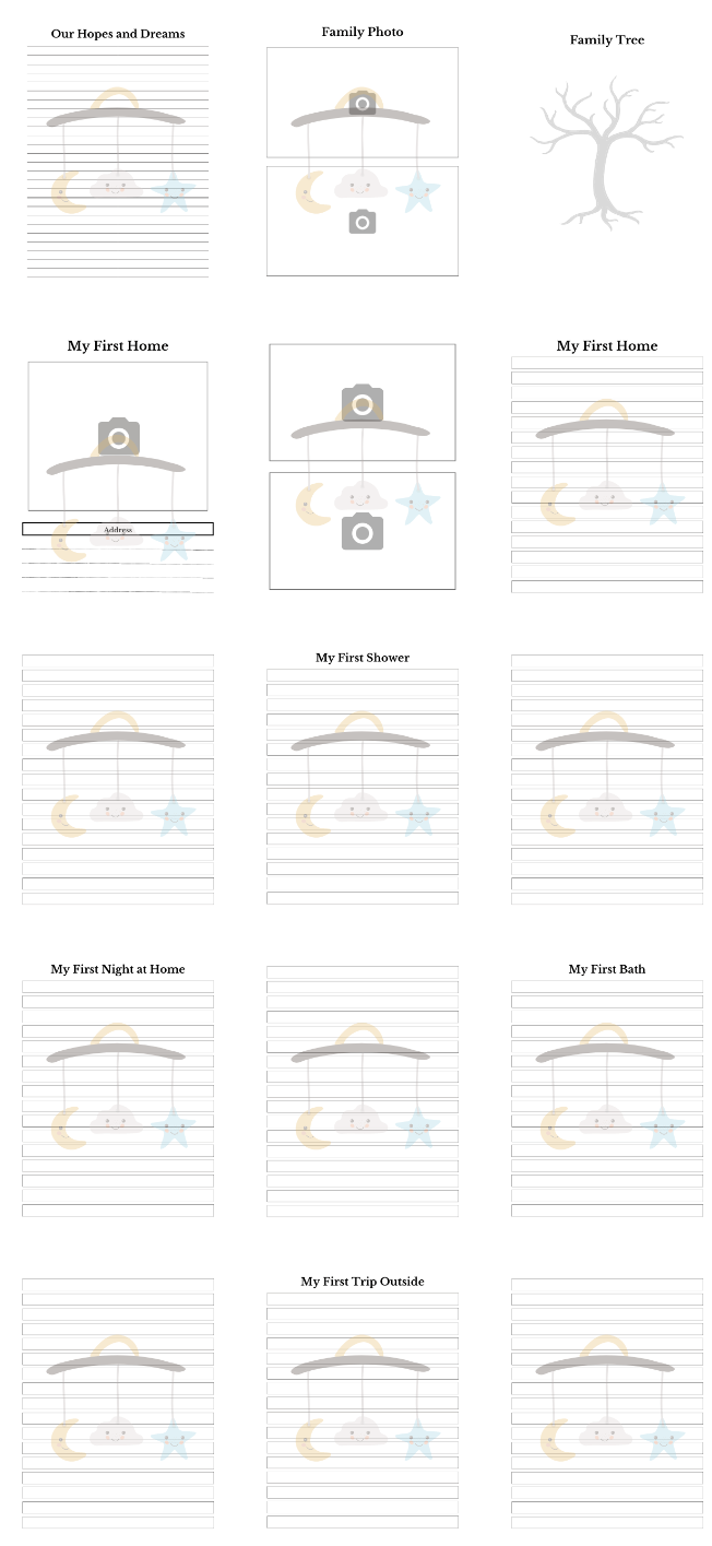 - Photo Pages: Dedicated pages for ultrasound images, baby photos, and family pictures.
